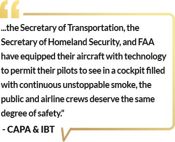 Both CAPA and ALPA, some of the largest pilot unions in the world, have supported smoke displacement as a viable and valuable method to safeguard pilots from blinding smoke in the cockpit.